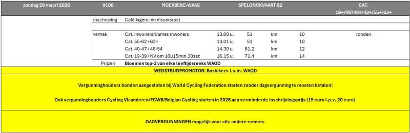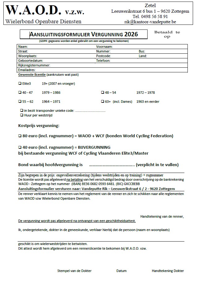 Welkom op de officiële website van WAOD, dé wielerbond voor gepassioneerde renners en supporters. Hier vind je alle informatie over onze wedstrijden, inclusief de kalender, reglementen en actuele klassementen.